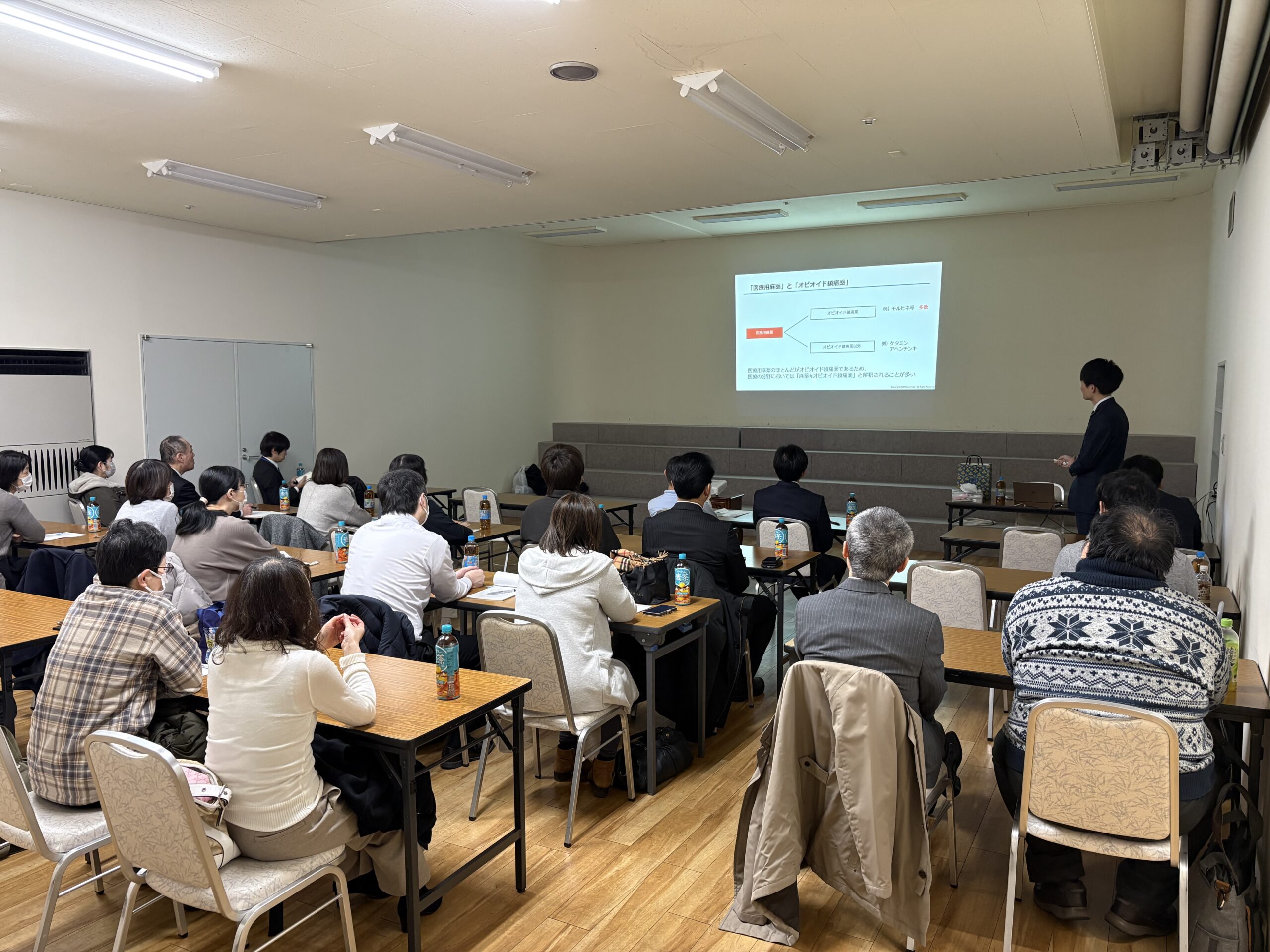 また、全体研修会に先駆けて薬局在宅委員会の活動として、緩和薬物療法認定薬剤師の外部講師をお招きし「PCAポンプ及び麻薬についての研修会」が開かれました。この研修会は、日々の業務の質向上と専門性の強化を目的として、薬局在宅委員会が企画したものです。所属薬局や経験年数を問わず、向上心を持つ有志が集まり、基本事項から応用までをじっくりと学ぶ時間となりました。